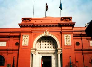 you speak Arabic?"って、話されへんっちゅーに!(怒) さて、そうこうする内に8時半。 9時に開くというチケット売り場にはコミケ並みの行列が出来ている。しまった!10時にはここから出なくちゃならないのに!烈作ってたら時間がないよ!(泣) (→)旗がハタハタとはためくカイロ博物館正門。オープンは9時ですのでお間違えなきよう。 するとその時、呆然とする私の傍らに、氷上のプリマドンナのようななめらかな動きで近寄ってきた血糖値が高そうなオヤジ。 「ガイドいらんかね?」「・・・」「所蔵品が多いからガイド無しではキツイよ」「・・・いくら?」「10ドルでいいよ」「オッサン、この博物館の所蔵品のこと全部知ってるの?」「おう!モチよ!何でも聞いてくれ!」「1時間しか時間がないから、的を得たガイドをして欲しいねん」「おぅ!任せとけ!」・・・というわけであっさり交渉成立。 するとチケット売り場の裏口に消えゆくオヤジ。体格の割に動きがやたらと軽快だね。 私の懐疑のまなざしにはお構いなしに、タヌキ腹のオヤジは私を引率して戸外ゲートをさっさと通り抜け、X線ゲートの警備者に親しげに挨拶、ノーチェックで館内にずんずんと進んで行く。 「キミ、いいガイドを雇ったね!彼はこの博物館のガイドナンバーワンだよ!」 とはいえ、それと同時に余りにも押しの強いオヤジのトッパぶりに、なお一抹の不安を拭い切れないのも確かであった・・・(3へつづく)