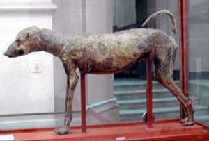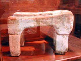 それは「神官は割礼を行っていた」というヘロドトスの記述によっても知られる「古代エジプトにおける割礼の記録」である。 イラストで見たそのシーンには、嫌がる少年(←ここがミソね)を押さえつけて割礼を施す情景が描かれており、これを日本で待つ同志への土産として是非ともカメラに収めなくては! だがそこに大きな問題が一つ。 日本語が母国語である私とアラビア語が母国語であるオヤジの会話は当然カタコト英語。 貴方は知っていますか「割礼」という英単語を?少なくとも「試験に良く出る英単語」には絶対載ってません。 ”サーカムシ・・ジ・・シオン・・・!!”と繰り返し絶叫して相手に意志を伝えようともう必死。 しかし妙齢の婦人の必死の努力とは裏腹に、オヤジは「え?え?ナニ?何が言いたいの?」というポカンとした面持ち・・・くそぉこのオヤジ!分からんやっちゃ! ”サーカム・・・シ・・ション・・・!!!”と口走りながら、最終手段としてオヤジの股間 決死の覚悟の甲斐あって、彼はすぐさま私の言わんとする事を理解し、心地よい回答を投げ返して下ささった。 「それはカイロ博物館には無いんだよん!パピルスにも残ってないんだよ〜ん!」(※1) チクショー!!!恥のかき損だ!! (左)やんごとなきお方の下着・・・そう、ツタンカーメンのパンツである。今で言うふんどしのような感じ。 しかしそこまでして割礼図を求め極東からやって来た乙女の有様を見て、何かビビビとくるところがあったのだろうか。 それからというもの、頼んでもないのに下ネタ関係に的を絞った的確きわまる案内をしてくれたオヤジ。 早産児のミイラ(※2)、人毛製のカツラ、赤ん坊のおくるみ、男性用下着、葬式の花輪、シャケの干物にしか見えないでかいサカナのミイラ、そしてトイレ等々・・・ "circumcision"で寄りそったエジプトとジャパンの心。海外旅行するときは是非とも覚えていきましょうこの英単語を・・・ たった一時間の鑑賞ではあったが、前日のツアーコースでの鑑賞とは比べものにならない満足度!今度行く時 ただこれで「日本人には下ネタ系がウケる」と勘違いしたオヤジが、次案内する日本人観光客相手にそういうブツばかり紹介したら・・・ゴメン、次の人。 (左)古代エジプトのトイレは座るタイプ。 社会の最上層はこのような木製や石製の便座の下に着脱可能な鉢を置いて使用した。 ※1・・・今振り返ると、観光客の下世話な質問にも即座に答えてくれるカイロ博物館のガイド達は、皆そろってかなり凄腕なのかもしれない。 割礼図のパピルスが残っているというのは、私の完全な勘違い。オヤジの言うとおり、割礼図のパピルスが現存しないというのは、帰国後必至で調べてやっと判明。なお、割礼についてはこちらをご覧下さい→☆ ※2・・・これは「アンケセナーメン(ツタンカーメンの妻)の早産児」だと紹介されたのだが、さすがにそれは無いんじゃないか?この赤ん坊のミイラは、展示室の隅の方の汚れたガラスケースの他の木棺の奥に隠されるように置かれていたが、貴重な資料だからあんなとこに置かないように思うのだが・・・ただ、カイロ博物館はカオスなのでありえないとも言い切れない。 「どうしてこんなとこに隠しているの?」と聞くと、オヤジは「光でこれ以上変質するのを避けるためだ」とか答えていたが、回答になっていない気がする。他の大人のミイラは厳重に管理されているというのに・・・ただ表の「ツタンカーメン関連室」に置いて人目にさらすものでもないのだが。 これと同様に、王妃アンケセナーメンがツタンカーメンの死後、夫の胸の上にそっと置いたまま、三千年を経てカーターに発見されたひからびた矢車菊の花束も、全く目立たない展示物の中にひっそりと紛れていた。 「貴方がこの度なした世紀の大発見である、ツタンカーメンの宝物の中で何が一番印象的でしたか?」とインタビューされ、カーターが答えて曰く「数千年前の夫婦の情愛を示す、葬儀の花束です・・・」と答えた有名な矢車菊なのだが。 ただ、そんなジーンとくるトークをしつつ、カーターが「発掘品第一号」として遺物番号を振ったのは、かの有名な「妻に香油を塗ってもらうツタンカーメン」を描いた金ピカの椅子だったそうだ。カーターさんてば正直なヒト! ※・・・吉村作治先生の著作によると「遺物番号1」となっていたが、近藤二郎先生が翻訳されたニコラス・リーブスの著作「黄金のツタンカーメン」(原書房)によると、この黄金の椅子の遺物番号は91.どちらが正しいのか素人には分かりかねますので、両方書いておきます。 (右)3200年前の猟犬(サルーキ又はスロウギー)のミイラ。王(アメンホテップ三世かホルエムヘブでないかと推測されている)の愛犬であった彼(彼女)は、ミイラにしてもらう程愛されていたようだ。 この写真、アメリカサルーキクラブの友人に送ったらもう大喜び。どんなジャンルでもマニアってやつぁ・・・(笑) |
