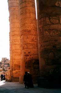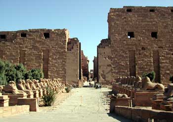 古代エジプトの代表的神殿として一般に最も広く知られており、遊戯王エジプト編の舞台であろうと思われる当時の首都テーベ(古代エジプト人は“ワセト”と呼んだ)に置かれた人類史上最大の巨大神殿複合体。 このカルナックとルクソールの神殿は王家の谷と並んで、「マハードの勤務先を訪ねる」という大きな声では言えないゆがんだ動機からも、私がこの度の旅行で最も楽しみにしていたものであった。 バスを降り、放し飼いのヤギ親子を追いかけ回しながら街路樹の小道を抜けると、突然広がる古代の風景・・・ とはいえ、写真で飽かず眺めたのとおんなじだよ〜!あたし今カルナックの参道にいるんだよ〜!と我ながらミーハーだとは思いつつもこの心の高ぶりは押さえ切れるもんじゃない。ガイドさん、説明は要らんっ!一刻も早く神殿内部へと馳せ参じたいっ!