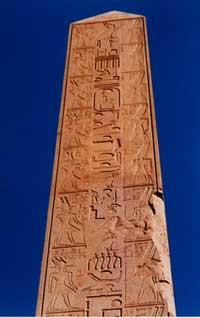 ![]() アメン大神殿の第四と第五塔門の間に立つハトシェプストのオベリスク。高さ約30m、重量約320t。 エジプトの空は真っ青だった。日本の空の青さとは全く異質な青、まさに紺碧の空。 |