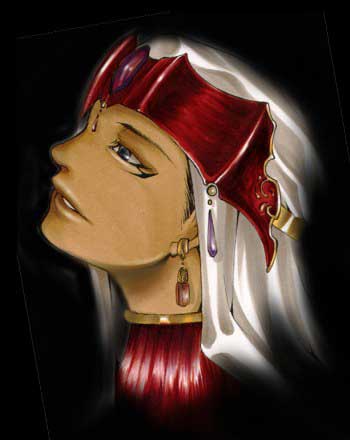 赤い装身具の男。 琥珀金の板に赤いファイアンスをはめ込んだネックレスと冠、それを飾るのは貴重な輸入品である クレタのバロックパールそしてアフガニスタンのラピスラズリ。イアリングはガーネット・・・ こんな贈り物、一体どなたから貰ったんでしょうか(笑) 笑顔のマハードを描きたかったギイさん。だけどどうしても寂しげな微笑になってしまうそうで。 神官になる前の彼ならもっと屈託なく笑っていたのかもしれませんねえ。