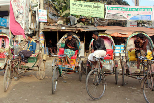 うわさ話に花を咲かせる客待ちのタクシーならぬ客待ちリキシャのドライバー