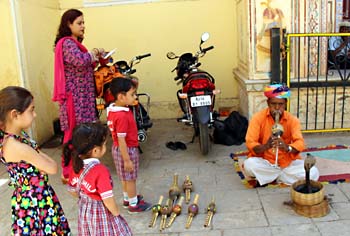 笛を吹いてコブラを操るおっさんを、興味津々で見つめるわらべたち。アンベール城(ジャイプール)