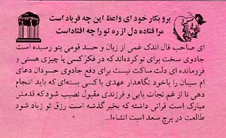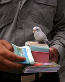 これ、「ハーフェズ占い」といって、ハーフェズの詩集から取った一節を印刷した紙片を小鳥に引かせるおみくじなんです。
