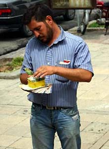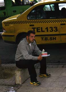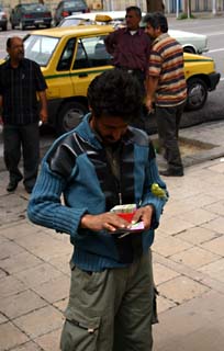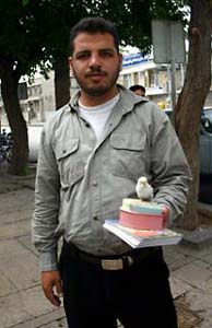 ハーフェズ廟の前の道路では、むくつけきひげ面のオッサンたちがウロウロ。よく見るとみんな手に小鳥を乗せている。一体なにをしてるのかな?
