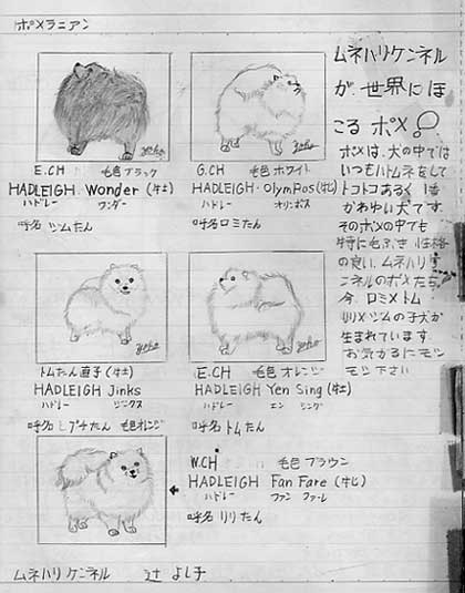 私は別にポメラニアンには興味がなかったのだが、ポメ好きの同級生の「私にも広告描いて描いて!」というリクエストにお答えしたものが下である。 右端のどす黒い部分はセロテープの跡。 ショードッグに興味がなければこのニュアンスは分かりづらいと思うが、なんやもうもの凄くリアリティーがある。 「お気軽にモシモシください」という部分なんか「愛犬の友」のブリーダー広告そのもの。 「ムネハリケンネル」というのは、ポメラニアンは胸を張ってショーポーズをすることから自分が付けた名前。 ちと安直にすぎる気もするが、ポメを描くだけでうんざりしていたらしい。 「ハドレー犬舎」というのは、当時の英国ポメラニアン界の最高峰。 後に日本人のお金持ちが買収したのだが、当時、興味のないトイドッグ界にまで注意を払っていたのかと思うと、子供のエネルギーには脱帽である。 でも、こんなことしとらんと勉強しろって!とタイムマシンに乗って自分の頭をこづきたい気もする。 未来から来た大人のび太も、きっと同じ気持ちだったんだろうな・・・ ![]() |