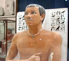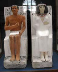 ![]() 古王国(第四王朝)の超有名な作品、ラーヘテプと妻ネフェルトの座像。古王国展示物の中では目玉なので、いつ見てもこの回りには観光客がわんさかわんさ。 |