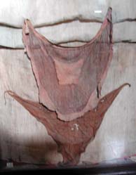 ←ツタンカーメンのパンツはメイン展示室にこれ見よがしに展示されており(マハ萌え旅行記参照)毎日世界中の至る所から訪れる観光客の好奇の眼差しにさらされている。私が見た時もきらびやかなサリーをまとった「インド婦人会」(憶測)の団体が興味深げに鑑賞していた。 しかしこれはそんな「VIP扱いのパンツ」からは遠く離れた場所・・・カイロ博物館でも「パンのなれのはて」だの「トイレ」だの「アカシアの小枝」といったフツーはぜったい見たくないような地味すぎな展示物が並ぶ外縁廊下に展示されている。 数千年の時を経て、西日に照らされひっそりと息づいている・・・まこと侘び寂び溢るるパンツだ。 しかしあなどるなかれ!これは(多分)素材がレザーのメッシュという、古代エジプトらしからぬマニア系腰布なのだ!! 以前エジプトの服飾専門書でこれの類似品(大英博物館所蔵)を目にしてからというもの、ぜひシャダマハの参考にと実物との対面を願っていたブツ・・・ いやしかしまぁ多分、墓に入れるようなものはすでに洗濯済みだろう。 |
