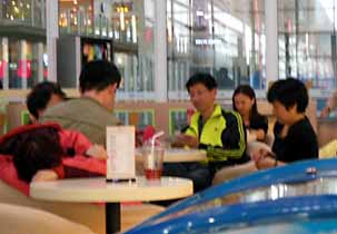 ウイグル行きの飛行機が飛び立つのは北京空港の端っこのウイング。人もまばらでお店もヒマそー。 そのせいだろうか、もう一発ビールを飲んだカフェのねーちゃんは、惚れそうになるほど愛想がよかった。