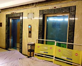 ものすごいやりかけっぷりのエレベーター。 二基のうち片方は動いてない上に、中層階にあるディスコに若者が群がってるせいで、ヨロヨロの我々はここでさらに30分待たされるのであった。