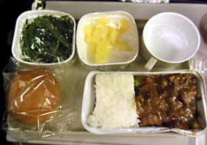 食事の喜びから「目で楽しむ」という要素を慎重に排除した中国南方航空の機内食。 黄色はタクワン、緑は茎ワカメ。茶色は肉シチュー。