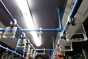 空港内でターミナルと飛行機を結ぶバスの吊り革もとい吊りプラスチック。