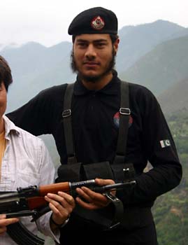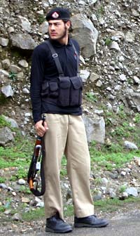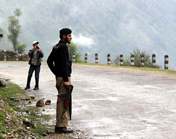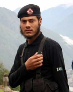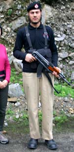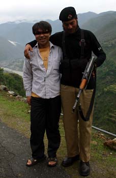 やがてバスはスワート谷の記念写真スポットに停車。おまわりさんもいっしょに降りてきた。 「うわーっ!きれい!」「なんだか懐かしい風景だね」と言い合いながら、霧にむせぶ緑の谷、清らかな川にファインダーを向ける人々。 一方、私のファインダーはおまわりさん一択だ。モロに写したら怒られるかもしれないから(警官や軍人は撮影拒否されることがけっこう多いのだ)、あっちを向いてる時を見計らってこそこそ盗撮……。スクール水着マニアの気持ちがちょっと分かった。 ←一番マシな盗撮作品。他の写真はぜんぶ超ピンぼけだった……。もっと磨かなきゃならんわ、盗撮テク。 清らかな心で雄大な自然にファインダーを向ける人々に混じって、言い訳程度に風景写真を撮るのみで、あとはおまわりさん鑑賞に余念がない私。それでもイスラームの縛りのきっつい地方の官憲におびえ、「写真、撮ってもいいですか?」と言い出せない私は、肝心なところで小心者だ。 その時、もじもじするばかりの乙女(嘘)を後目に、堂々と声を掛ける者がいた。ジンバブエで荷物を紛失されたのよぉとか言ってた、旅慣れたおかっぱ女史だ! カメラを指さし身ぶりで「一緒に記念撮影してください」と話しかけたおかっぱ女史。ふおっふおっふおっ、やっとおまわりさんのイケメンぶりに気付いたか!と満足感を覚えたのもつかの間で、同行者に次々と記念撮影を頼まれて大人気のおまわりさんを見て、「わたしが一番最初に目ぇつけたのに……」とちょっぴり悔しくなるのであった。 ![]()