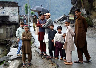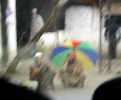 おまわりさんと別れた警察詰め所の前で、ごっつい傘をさしていたパシュトゥンおやじ。 カメラを向けて怒られたら困ると、ファインダをのぞかずに勘でレンズを向けたら……見事なピンぼけ!やっぱ盗撮の腕、磨かなきゃ。 |