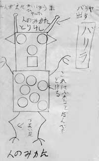 「ちていロボットバリラ」 私は今でも人間と機械モノを描くのがひじょうに不得意なのだが、こうやって見ると昔からその不得意ぶりをいかんなく発揮していたようだ。 「これに触れると何でも溶ける」って、 ただの段ボール箱ちゃうんかこれ?! |