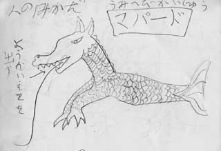 “海蛇怪獣・マパード” ゲスナーの「怪物誌」に載っていそうなクラシックなたたずまいの怪物である。 「パ」が「ハ」ならば「今の自分の萌えの源流がこんなところに!?」と喜べるのだがちょっと残念なうみへびかいじゅうマパード。 |