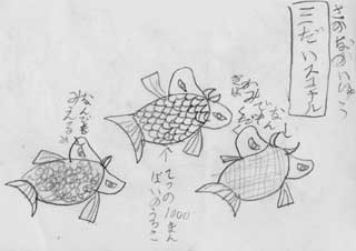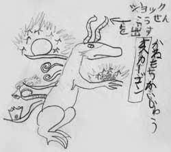小学校一年生の頃の「わたしが考えた怪獣帳」(全10巻)より“サカナ怪獣・三大スコチル”。 幼い頃から筆を持たせると怪獣と猛獣と猛禽類しか描かない子供だったそうだが、その中でもこれは「三大スコチル」という思いつきのネーミングが非常にカッコ良く思えお気に入りだった。 それにしても「鉄の1000万倍の(固さの)うろこ」とは・・・どんな固さや。 ゼロを沢山付ければ何でも解決できた気になるのは万国の子供の共通点? |
