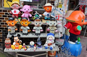![]() コレクターの多いサトちゃんのバリューを、店主は本当に分かっているのかいないのか。一番下段のがらくた打線がサトちゃんのプレミア感をぶち壊し。 |