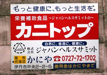 ![]() 自然に、普通に、健康に。ジャパンヘルスサミットのカニトップ!と言われても、実体がさっぱり分からんカニトップ。 赤を使っているところや「栄養補助食品」というあたりからして、多分カニの甲羅から抽出したキチンキトサンうんぬん……というブツかもしれない。 「ご用命はかにやまで」もひっかかる。カニトップが先にあって店を「かにや」にしたのか、「かにや」の作った商品だからカニトップなのだろうか……? |