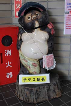 ![]() 信楽駅を降りるとテツコ駅長。駅前にはジャンボなどキ○タマ。タヌキの焼き物だってキ○タマだって、大きけりゃいいってもんです。 |