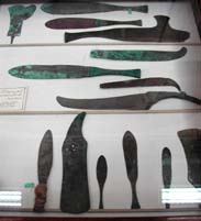 カイロ博物館の剃刀各種。この度のエジプト旅行の目的の三分の一は「剃毛のための剃刀見学」であった・・・ これらの素材はほとんど青銅である。 ここに儀式用のものは写っていないが、斧の形そのものを想像していただければよいかと。