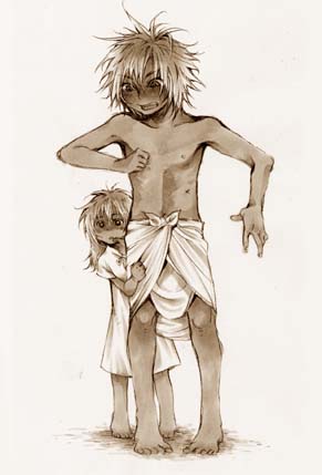 そんな貧民窟の住人たち、パン釜の前で小麦をふるいにかけているしわくちゃの小さな老婆や、胸からぶら下げた赤ん坊をあやしながらイナゴマメの皮をむいている母親は、こんな所には場違いな育ちの良さそうな少年を目にして、ただ驚いたように黙ってシャダを見つめるのであった。