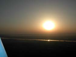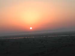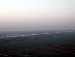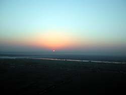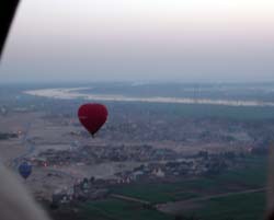 | テーベいやルクソールでは東岸に宿泊施設が集中しているため、夕日は簡単に見られても地平線から顔を出す朝日はよほど早くからネクロポリスに渡らない限り見ることが出来ません。 | そこで「古代エジプト人と同じものを見たい」というミーハー気分なこの度の旅では、大枚(250ドル)はたいて西岸の気球から朝日を拝んで参りました。 |
