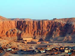 ![]() 背後にはネクロポリスの断崖。小さく見えるのは実はでかいハトシェプスト葬祭殿、さらに豆粒みたいなのはクル・エルナいやエル・クルナの慎ましい住宅群である。子バクラはいなかった。 |
