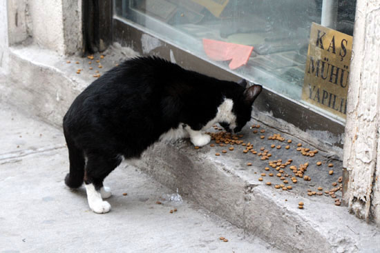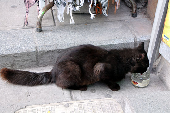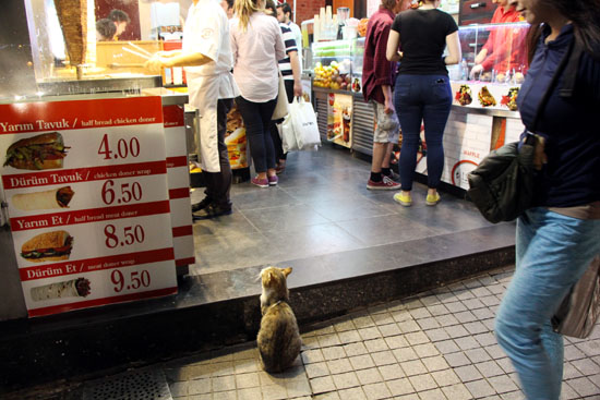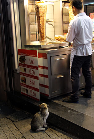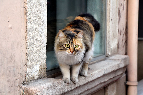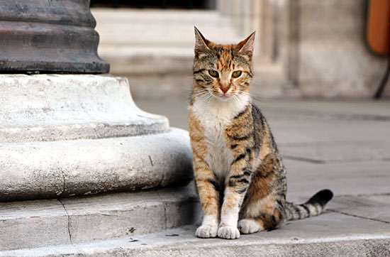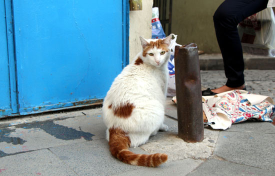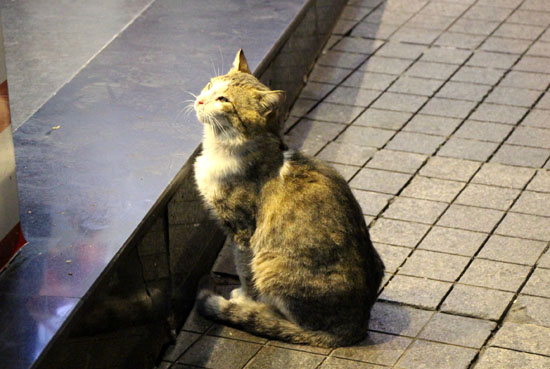 夕暮れのイスティクラール通りで見つめる猫
