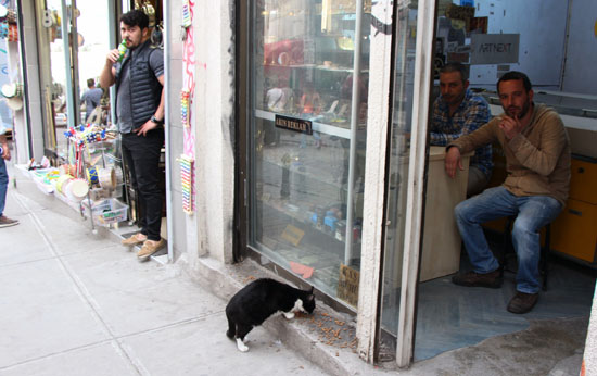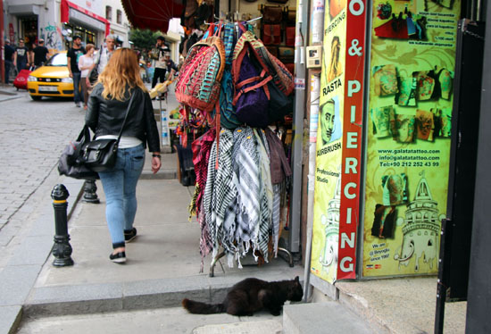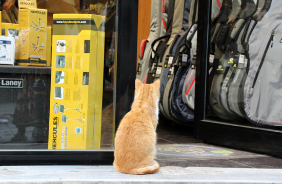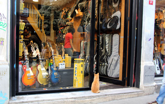 ガラタ塔ふもとの楽器店をのぞく猫。