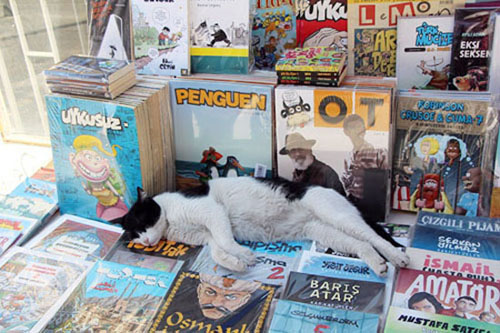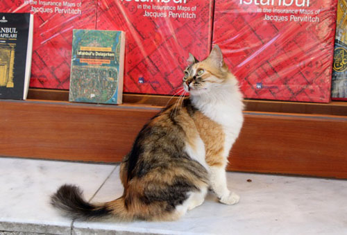 「イスタンブール」という本を並べたイスタンブールの本屋の猫